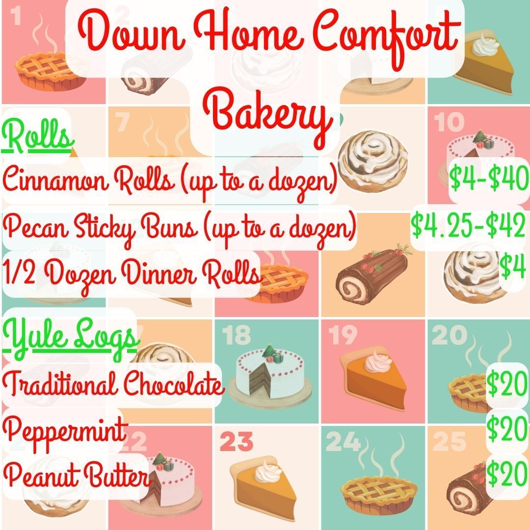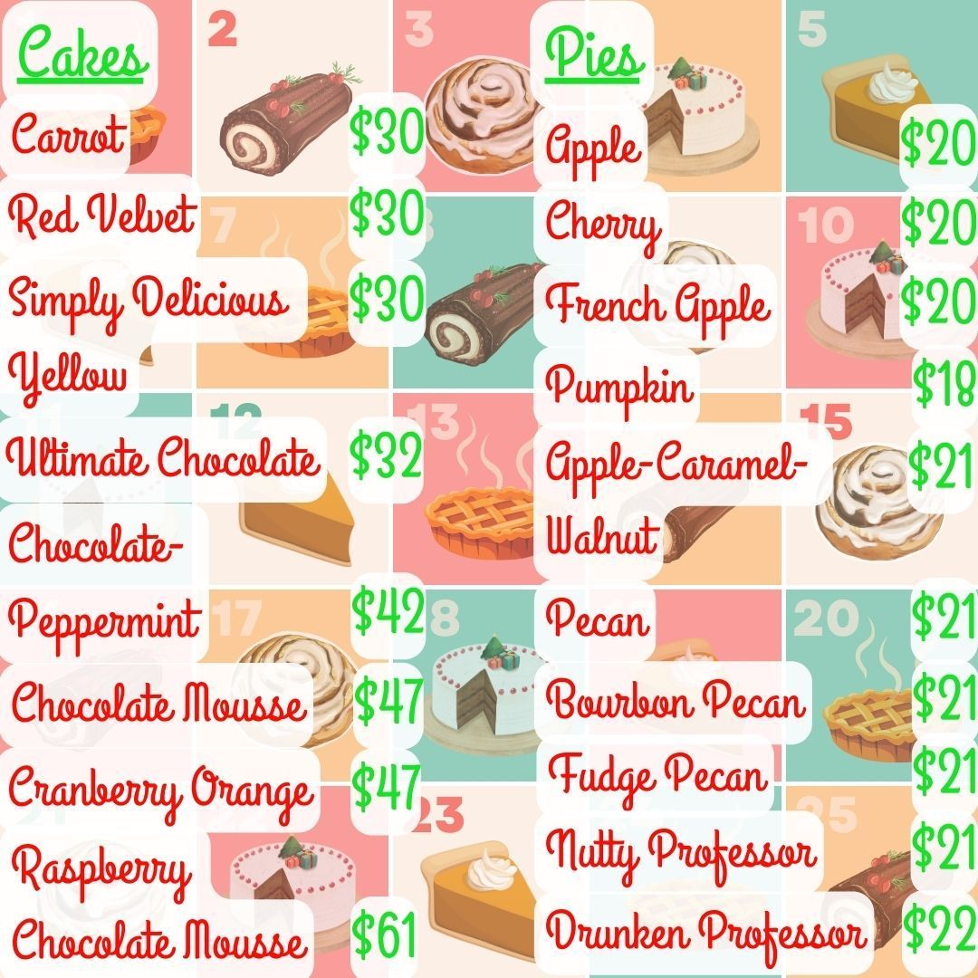 Christmas is coming up fast, and we're ready for your orders! Choose from a selection of our pies, cakes, yule logs, and breakfast rolls, and put your order in quick! Due to our staffing situation, we will be closing orders on Tuesday, December 16th, at 6pm. We hope to hear from you soon!